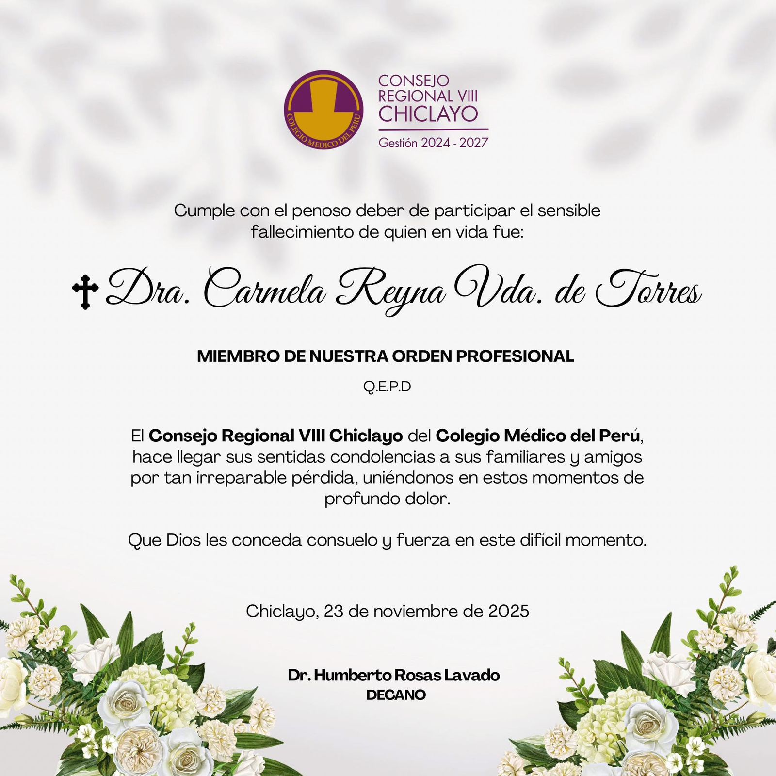 El decano, Dr. Humberto Rosas Lavado, la Junta Directiva y los miembros del Consejo Regional VIII Chiclayo expresan sus más sentidas condolencias por el fallecimiento de la Dra. Carmela Reyna Vda. de Torres, destacada profesional de la salud y miembro de nuestra Orden. Que su legado y vocación de servicio perduren como ejemplo entre sus colegas.