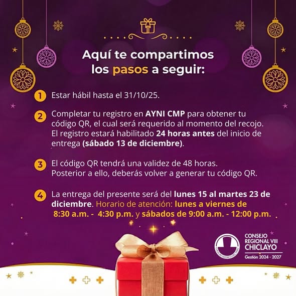 Esta Navidad, el Colegio Médico del Perú decidió, a través de un acuerdo del Consejo Nacional, la entrega de un presente único para todos los médicos del país, por lo que el comunicado anterior emitido por nuestra sede regional queda sin efecto, en atención a las nuevas directrices. Desde el Consejo Regional Chiclayo nos sumamos a esta iniciativa nacional que fortalece la identidad médica, la equidad y el sentido de unión entre todos nuestros colegiados.
